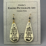 These Gold Filled handcrafted 40x20mm teardrop bone earrings have contemporary scrimshaw of traditional Eskimo designs. Activities such as hunting, fishing, dancing, warfare, village scenes and shamanistic ceremonies. The arrival of the Yankee whaling fleet in the late 1800's signaled the end of this early art style among the Eskimos as the whaler man's scrimshaw influenced them to create more realistic depictions. Although primitive in form, this fascinating early stick figure artwork is extremely powerful and has a universal appeal today.