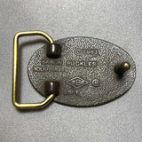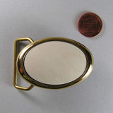 Beautiful small oval wide rim polished brass dress buckle with 43mm x 30mm domed ivory mammoth cabochon, tan color. This buckle will fit a 1” to 1 1/4” wide belt. These are out of production vintage buckles, when our old stock is gone there will be no more, we have 5 left. The ivory is set with a sticky adhesive but can be removed for scrimshaw purposes.