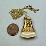 Narwhals, the mysterious unicorns of the sea, live in the Arctic Ocean and grow to about 18' (not including the tusk). The males grow an elongated tooth that spirals out clockwise to form a tusk reaching 9' in length. This ivory tusk has been attributed with the creation of the unicorn legends. The tusks have a small hollow that runs nearly the full length, the ivory has no grain or core like elephant, mammoth or walrus but looks more like sperm whale ivory with a pencil sized hollow. Narwhals have been a protected species since 1972 and importation is prohibited. We have a selection of old tusks for sale that were imported in the mid-1900s and are legal to sell anywhere in the U.S. (with the exception of New Jersey). These are extremely rare if you can find one. Now is your opportunity to own the rarest, most mysterious, unique and beautiful of the ivories and at a reasonable price. Fine 14k Gold plated brass with beautiful fan shaped narwhal piece polished glassy smooth. Chain is included.