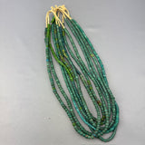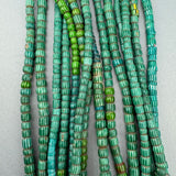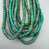 Eexceptionally beautiful old strands of green chevron trade beads with the wonderful red & white star pattern revealed on the ends. The glass was layered in canes, then cut, the design resulting from the layering and revealed on the cut end gave them the names of "Star" or "Rosette" beads. A very popular design and certainly one of the most fascinating of the early trade beads, shapes and shades of green are mixed on strands we only have these few left then gone forever. CLOSEOUT