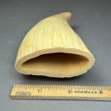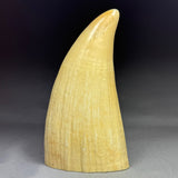 Here is a handsome old sperm whale tooth, 5 1/2" tall around the curve and 2 1/2 " wide at the base." long measured around the curve and weighs well over 1/2 pound (9 ounces), it has been trimmed to stand upright. Please don't order this to be shipped outside of Washington state, we cannot ship this out of state and will cancel the order and refund you, an unnecessary effort for both of us. You can also call and order 800-423-1945