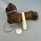 A statement piece. Beautiful genuine Narwhal Ivory pendant (2" long) x 3/8" wide with rhodium plated chain and sterling silver eye screw. Beautifully shaped with polished back side. Made from a tusk that was imported from Pond Inlet Nunivat Canada in the 1960’s by the J. L. Houston Company of Seattle. We hand made this pendant from stock we acquired from the Houston Company in 2013 before they closed their doors forever. When our stock is gone there will be no more, narwhal can no longer be imported into the U.S. (since 1972). The invoice will state that "to the best of our knowledge and belief this narwhal ivory predates the 1972 Marine Mammal Protection Act." This is the language that National Marine Fisheries requires sellers supply to buyers.
