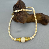 Mammoth Ivory Graduated necklace. The necklace highlights in the center a 12mm prehistoric mammoth ivory bead flanked by 2 Gold Plated Silver Balinese style bead caps. The bead graduations continues to 5mm and finishes with 4mm beads. The lobster clasp is Gold Plated sterling silver. A unique and beautiful necklace made In house.  18" long.